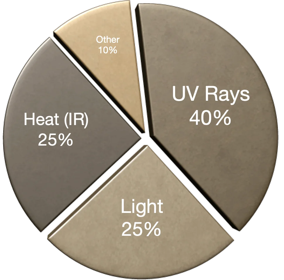 The three main factors in fading are ultraviolet rays, visible light, heat, and a small percentage is indoor lighting and humidity. According to our experiences with industry meters, visible light has been greatly underrated for many years. Unfortunately there aren’t any official charts available that depict the actual fade calculations as stated by the standard of NFRC 300 but that hasn’t stopped us from forwarding you the information you deserve.